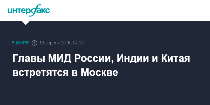 "18 апреля в Москве состоится 14-я встреча министров иностранных дел в формате РИК - России, Индии и Китая", - сказала ранее на брифинге официальный представитель МИД РФ Мария Захарова.