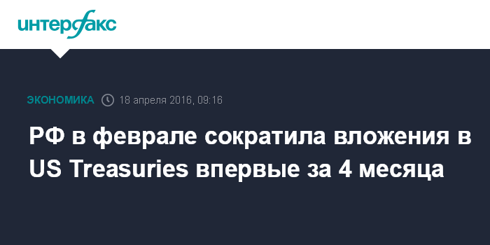 Москва. 18 апреля. INTERFAX.RU - Россия сократила вложения в казначейские обязательства США (US Treasuries) в феврале 2016 года на $9,3 млрд, до $87,6 млрд. Снижение покупок отмечено впервые за четыре месяца, свидетельствуют результаты исследования американского Минфина и Федеральной резервной системы.