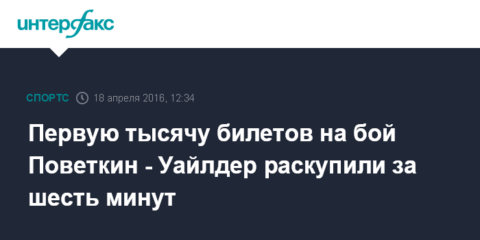 Москва. 18 апреля. INTERFAX.RU - Руководитель промоутерской компании "Мир бокса" Андрей Рябинский сообщил о высоком темпе продаж первых билетов на бой с российского боксера Александра Поветкина с чемпионом мира по версии WBC Деонтеем Уайлдером.