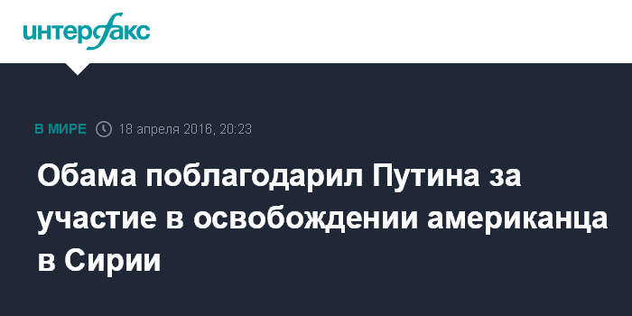 Москва. 18 апреля. INTERFAX.RU - Президент США Барак Обама выразил благодарность российскому лидеру Владимиру Путину за содействие, которое РФ оказала при освобождении американца Кевина Доуса, который был задержан властями Сирии.