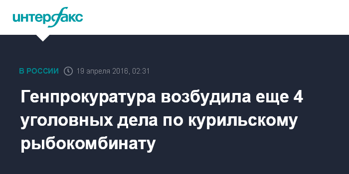 Москва. 19 апреля. INTERFAX.RU - Заместитель генерального прокурора РФ Юрий Гулягин на брифинге во вторник в Южно-Сахалинске сообщил, что по итогам поездки комиссии генпрокуратуры и Роструда на Сахалин возбуждены четыре новых уголовных дела по курильскому рыбокомбинату "Островной"
