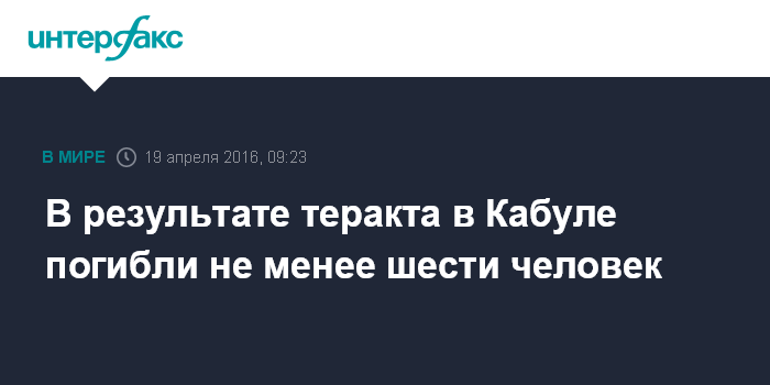 Москва. 19 апреля. INTERFAX.RU - Как минимум шесть человек погибли и более 20 получили ранения утром во вторник в результате взрыва заминированного автомобиля в Кабуле, сообщают местные СМИ.
