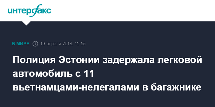 Москва. 19 апреля. INTERFAX.RU - В Эстонии в ночь на 12 апреля полиция провела крупную операцию, в ходе которой был задержан автомобиль Ford Mondeo, в багажнике которого находились 11 взрослых вьетнамцев - одна женщина и десять мужчин.