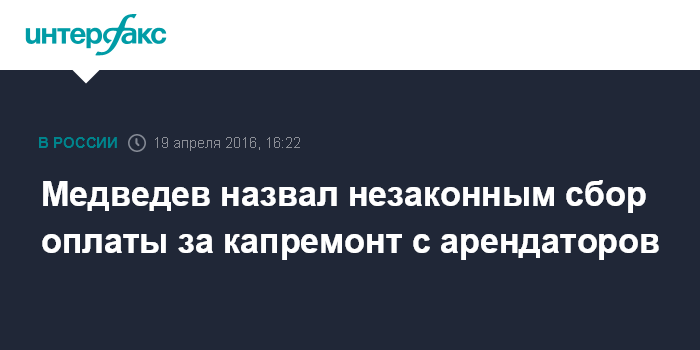 Москва. 19 апреля. INTERFAX.RU - Премьер РФ Дмитрий Медведев назвал незаконными попытки отдельных властей регионов РФ переложить бремя уплаты взносов на капремонт жилья на нанимателей, не являющихся собственниками помещений.