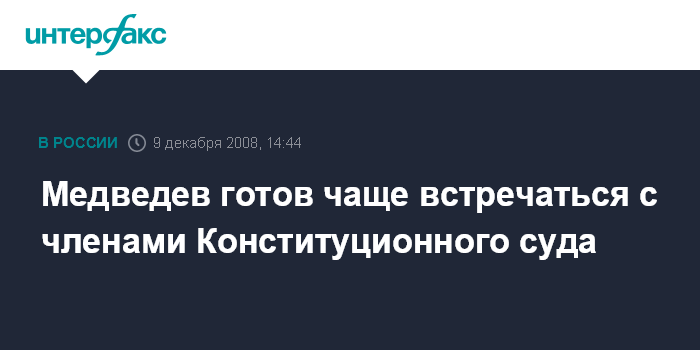 "Может быть, есть резон чаще встречаться в таком широком составе, обсуждать вопросы законодательства, реагирования на основные проблемы, которые существуют в государстве и обществе", - сказал Медведев во вторник на встрече в Кремле с членами Конституционного суда РФ. Президент отметил, что встреча проходит в преддверии отмечаемого 12 декабря Дня Конституции РФ, которой исполняется 15 лет.
