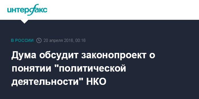 Москва. 20 апреля. INTERFAX.RU - Госдума в среду рассмотрит в первом чтении проект закона об уточнении понятия политической деятельности НКО. Соответствующий законопроект внесен в конце февраля представителями всех четырех парламентских фракций.