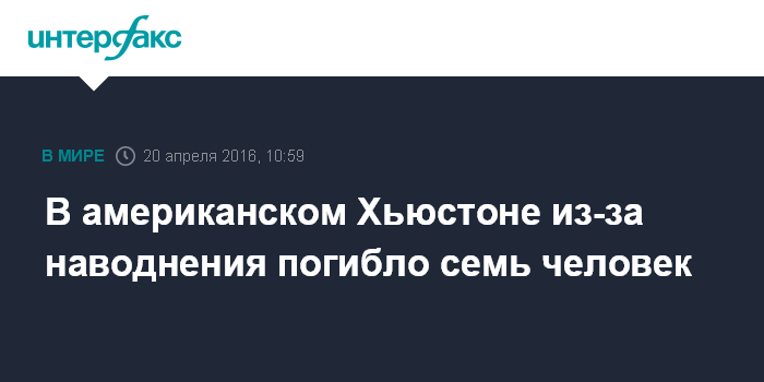 Москва. 20 апреля. INTERFAX.RU - В американском городе Хьюстон (штат Техас) из-за наводнения погибло семь человек, город и прилегающие к нему районы объявлены зоной стихийного бедствия, сообщило в среду агентство AP.