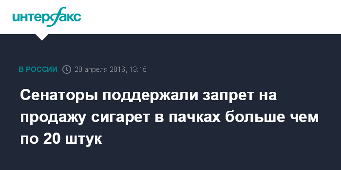 Москва. 20 апреля. INTERFAX.RU - Совет Федерации на заседании в среду одобрил закон, запрещающий продавать более 20 сигарет в одной пачке. Закон вступит в силу с 1 июля текущего года.