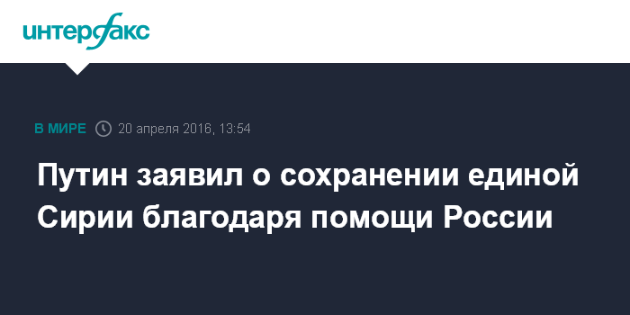 Москва. 20 апреля. INTERFAX.RU - Российская поддержка законного правительства Сирии помогла предотвратить развал страны и избежать новых массовых жертв среди мирного населения, заявил в среду президент РФ Владимир Путин.