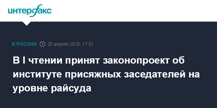 Москва. 20 апреля. INTERFAX.RU - Госдума на заседании в среду приняла в первом чтении законопроект о сокращении числа присяжных заседателей с 12 до восьми человек в областных судах и введении института присяжных заседателей на уровне районного суда.