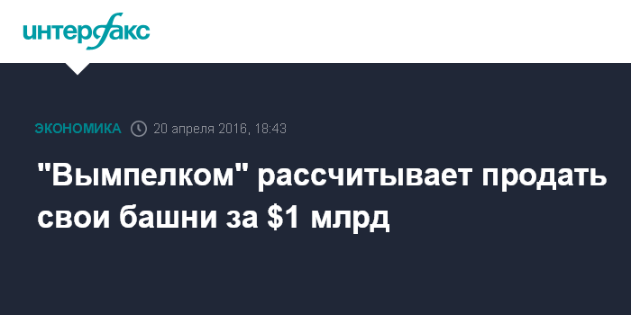 Москва. 20 апреля. INTERFAX.RU - ПАО "Вымпелком" хочет продать свою башенную инфраструктуру на территории РФ примерно за $1 млрд, сообщили "Интерфаксу" два источника, знакомых с ходом тендера.
