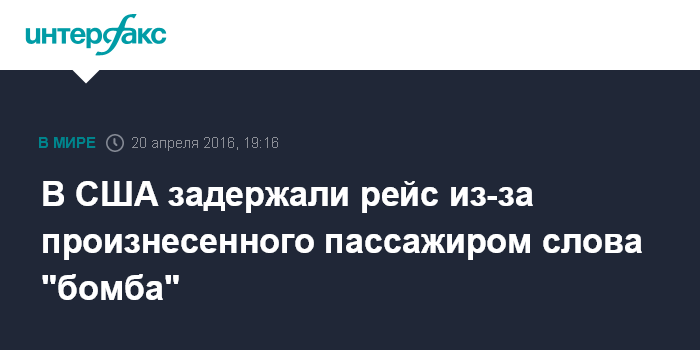 Москва. 20 апреля. INTERFAX.RU - Внутренний рейс американской авиакомпании United Airlines был задержан после того, как один из пассажиров произнес слово бомба, сообщает агентство AP.