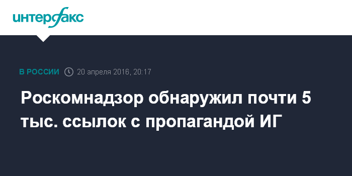 Москва. 20 апреля. INTERFAX.RU - Роскомнадзор выявил в интернете около 5 тысяч ссылок на пропаганду запрещенного в РФ "Исламского государства", сообщает ведомство в фейсбуке.