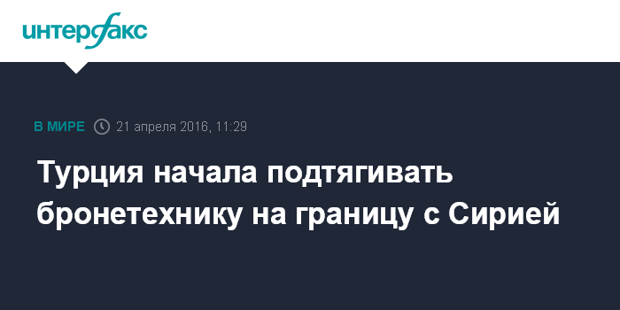 Москва. 21 апреля. INTERFAX.RU - Турция наращивает число танков на границе с Сирией в качестве меры предосторожности из-за недавних обстрелов турецкой территории, предпринятых со стороны Сирии боевиками "Исламского государства" (ИГ, организация, запрещенная в РФ), сообщила в четверг турецкая газета Hurriyet.