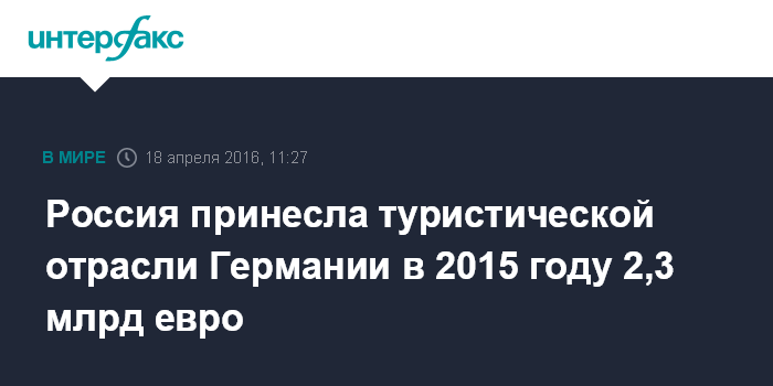 Москва. 18 апреля. INTERFAX.RU - Россия занимает седьмое место в списке стран, принесших наибольший доход туристической отрасли Германии в 2015 году, заявила в понедельник глава национального туристического офиса ФРГ Петра Хедорфер.