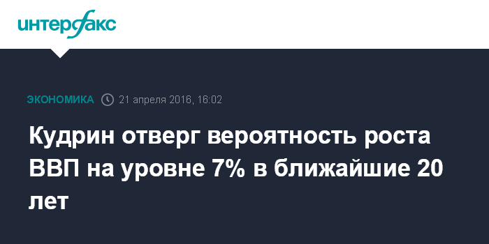 Москва. 21 апреля. INTERFAX.RU - Возврат России к темпам роста ВВП 2000-х годов на уровне семи процентов в год в ближайшие 20 лет невозможен, полагает бывший министр финансов РФ Алексей Кудрин.