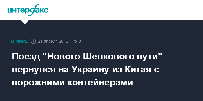 Москва. 21 апреля. INTERFAX.RU - Первый экспериментальный грузовой поезд, который был запущен 15 января 2016 года по так называемому "Новому Шелковому пути", 17 апреля вернулся из Китая на Украину, сообщили агентству "Интерфакс-Украина" в пресс-службе ПАО "Укрзализныця".