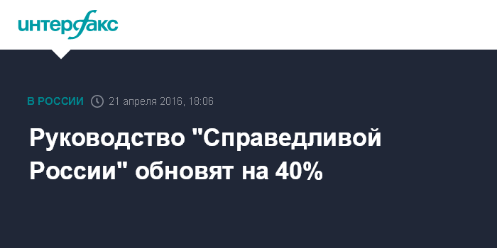Москва. 21 апреля. INTERFAX.RU - Руководство партии "Справедливая Россия" на предстоящем съезде обновится на 40%, заявил в интервью "Интерфаксу" лидер "эсеров" Сергей Миронов.