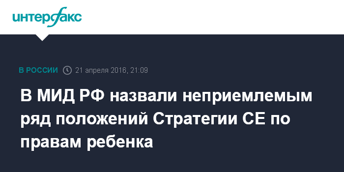 Москва. 21 апреля. INTERFAX.RU - Ряд пунктов принятой Комитетом министров Совета Европы в начале марта "Стратегии Совета Европы по обеспечению прав ребенка на период 2016 - 2021 гг." неприемлем для России, и Москва будет реализовывать только те положения документа, которые отвечают национальным интересам РФ, заявляют в МИД России.
