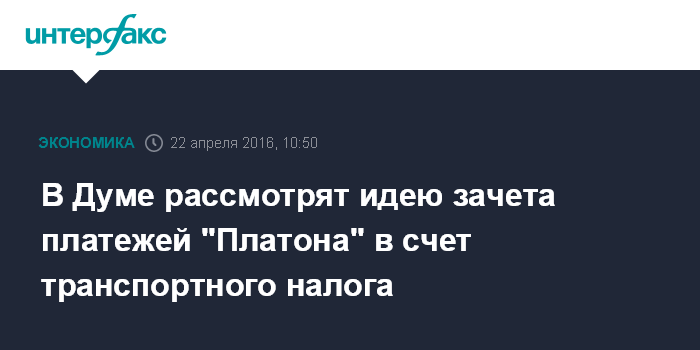 Москва. 22 апреля. INTERFAX.RU - Правительство РФ внесло в Госдуму законопроект, которым предполагается засчитывать платежи в системе взимания платы с грузовиков "Платон" в счет уплаты транспортного налога юридических и физических лиц, использующих автомобили с разрешенной максимальной массой более 12 тонн, говорится в распоряжении, опубликованном на сайте правительства.