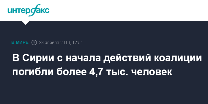 Москва. 23 апреля. INTERFAX.RU - Свыше 4,7 тыс. человек, большей частью боевиков погибли за 19 месяцев с начала действий международной коалиции против "Исламского государства" (террористическая группировка, запрещенная в России) под руководством США в Сирии, сообщил в субботу сирийский Наблюдательный центр по правам человека.