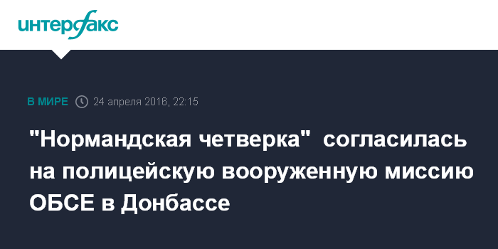 Москва. 24 апреля. INTERFAX.RU - Президент Украины Петр Порошенко заявил, что партнеры по "нормандской четверке" соглашаются на размещение в Донбассе полицейской вооруженной миссии ОБСЕ.