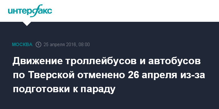 Москва. 25 апреля. INTERFAX.RU - Движение общественного транспорта снимается с Тверской улицы, Страстного и Тверского бульваров 26 апреля в связи с подготовкой парада на Красной площади, сообщили "Интерфаксу" в пресс-службе ГУП "Мосгортранс" в понедельник.