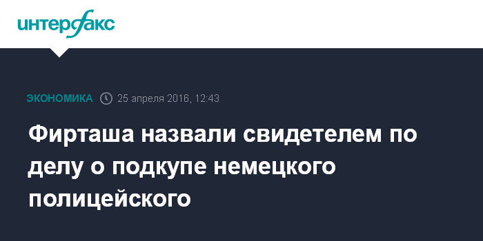 Москва. 25 апреля. INTERFAX.RU - Бизнесмен Дмитрий Фирташ проходит свидетелем по делу о подкупе представителя уголовной полиции Германии, сообщает Deutsche Welle со ссылкой на расследующую дело прокуратуру города Шверин.