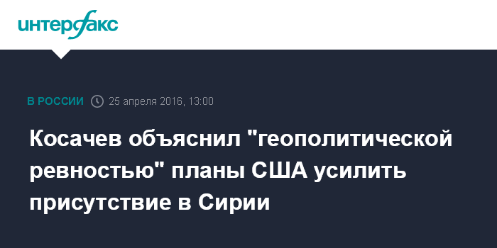 "Здесь играет роль не столько количественный (по-прежнему не предполагается непосредственное участие американцев в боевых действиях), сколько символический показатель. Очевидно, что здесь и желание повысить влияние США на сирийские процессы, где роль "первой скрипки" с недавних пор все чаще играет Россия: ситуация, явно вызывающая "геополитическую ревность" Белого дома", - сказал Косачев "Интерфаксу" в понедельник.