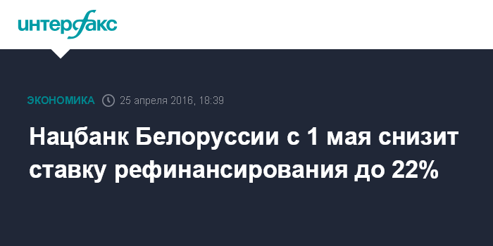 Москва. 25 апреля. INTERFAX.RU - Национальный банк Белоруссии принял решение о снижении ставки рефинансирования с 24% до 22% годовых с первого мая, говорится в сообщении банка.