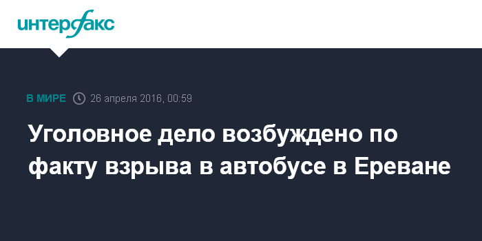 Москва. 26 апреля. INTERFAX.RU - Уголовное дело возбуждено в связи со взрывом в пассажирском автобусе в Ереване, заявила советник генерального прокурора Армении Кристине Мелконян.