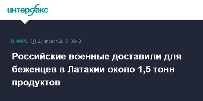 Москва. 26 апреля. INTERFAX.RU - Около полутора тонн гуманитарной помощи для более чем 170 человек доставили российские военные в центр по приему беженцев, расположенный в сирийском городе Латакия, сообщил журналистам начальник группы формирования и доставки гуманитарных грузов российского Центра по примирению враждующих сторон в Сирии подполковник Виталий Вербицкий.