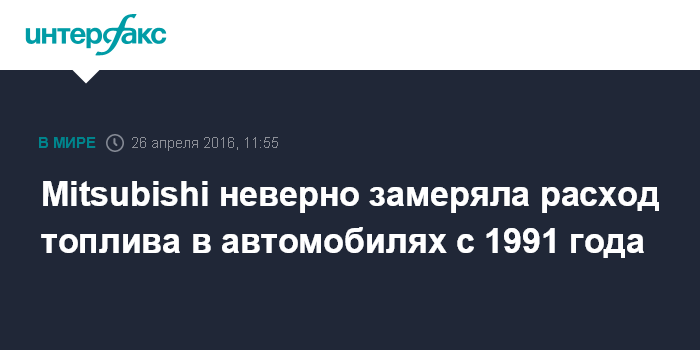 Москва. 26 апреля. INTERFAX.RU - Японская компания Mitsubishi Motors Corp. допускала нарушения при определении показателя расхода топлива в своих малолитражных автомобилях как минимум с 1991 года, приводит агентство Bloomberg слова представителей компании.