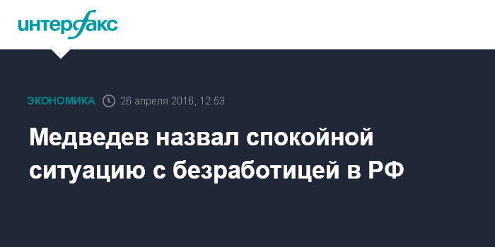 Москва. 26 апреля. INTERFAX.RU - Ситуация с безработицей в России в целом достаточно спокойная, заявил премьер-министр РФ Дмитрий Медведев на годовой коллегии Минэкономразвития.