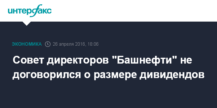 Москва. 26 апреля. INTERFAX.RU - Рекомендация по размеру дивидендов "Башнефти" по итогам работы в 2015 году будет утверждена советом директоров после получения соответствующих директив от правительства РФ, сообщила компания по итогам заседания совета директоров, где планировалось принять решение по размеру дивидендов.