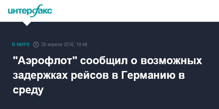 Москва. 26 апреля. INTERFAX.RU - Рейсы "Аэрофлота" в Германию и обратно в среду, 27 апреля, могут быть задержаны из-за забастовок в этой стране, сообщил перевозчик.