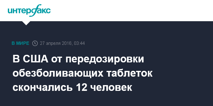 Москва. 27 апреля. INTERFAX.RU - В столице штата Калифорния - Сакраменто 12 человек умерли от передозировки обезболивающих таблеток, сообщил телеканал ABC в среду.