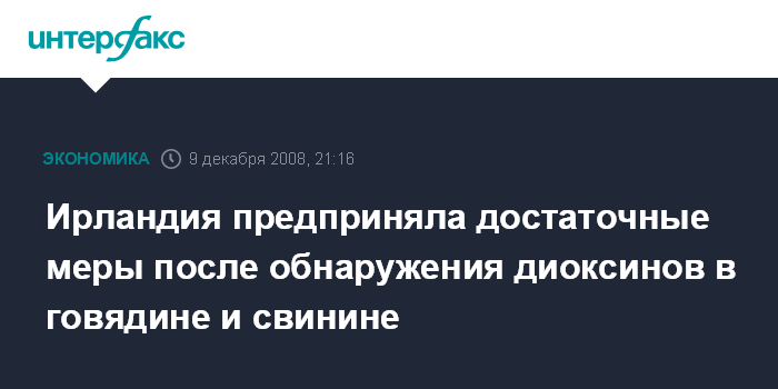 Москва. 9 декабря. INTERFAX.RU - Европейская Комиссия (ЕК) удовлетворена мерами, принятыми в Ирландии в связи с обнаружением следов диоксина в свинине и говядине.