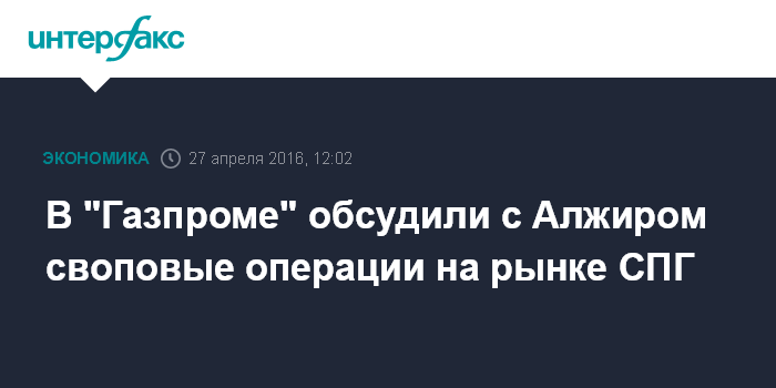 Москва. 27 апреля. INTERFAX.RU - Группа "Газпром" ведет переговоры с Алжиром об своповых операциях на рынке сжиженного природного газа, сообщается в материалах, распространённых в преддверие встречи премьер-министра РФ Дмитрия Медведева с премьером Алжира Абдельмалеком Селлялем.