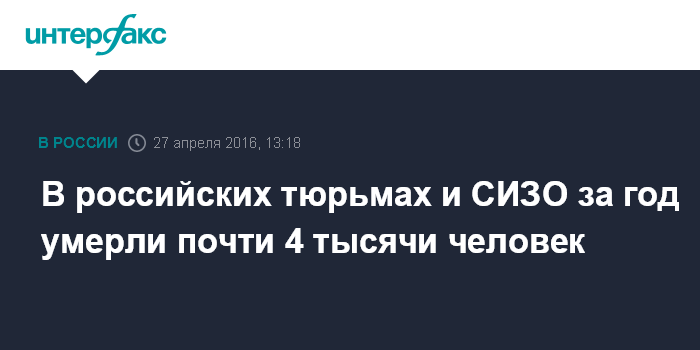 Москва. 27 апреля. INTERFAX.RU - Почти четыре тысячи человек умерли в местах лишения свободы в России в 2015 году, подавляющее большинство из них - из-за плохой медицины, заявил генеральный прокурор РФ Юрий Чайка.