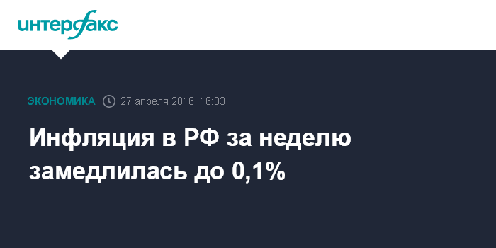 Москва. 27 апреля. INTERFAX.RU - Инфляция в РФ с 19 по 25 апреля 2016 года составила 0,1%, сообщил в среду Росстат.