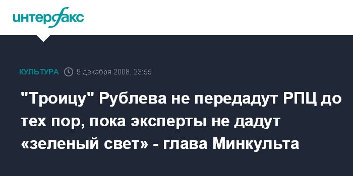 "Любую икону, а тем боле шедевр мировой культуры - чудотворную икону Русской православной церкви можно перемещать только тогда, когда есть стопроцентная гарантия того, что икона сохранится в том же виде, в котором она находилась до перевозки", - сказал А.Авдеев в эфире радиостанции "Эхо Москвы", отвечая на вопрос, какова позиция министерства по поводу временной передачи "Троицы" Рублева из Третьяковской галереи РПЦ?