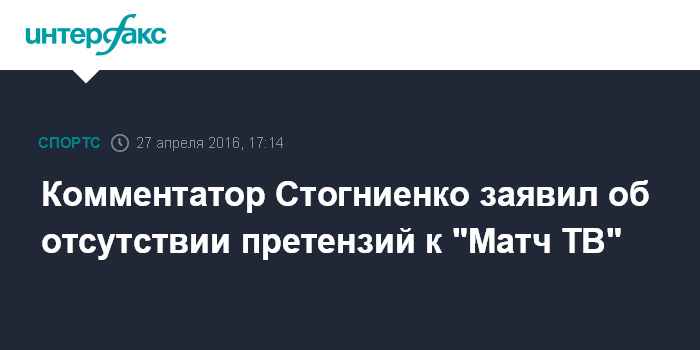 Москва. 27 апреля. INTERFAX.RU - Спортивный комментатор Владимир Стогниенко, покидающий "Матч ТВ", заявил, что не имеет к телеканалу никаких претензий.