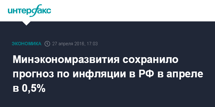 Москва. 27 апреля. INTERFAX.RU - Минэкономразвития сохраняет прогноз по инфляции в РФ в апреле на уровне 0,5%, в мае также ожидает рост цен в пределах апрельских значений, заявил "Интерфаксу" представитель министерства.