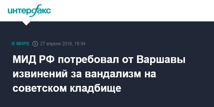 Москва. 27 апреля. INTERFAX.RU - Москва потребовала наказать виновных и принести официальные извинения за шестой с начала года акт вандализма, который произошел в ночь на 25 апреля в Польше - на этот раз на мемориальном кладбище офицеров Советской Армии во Вроцлаве.