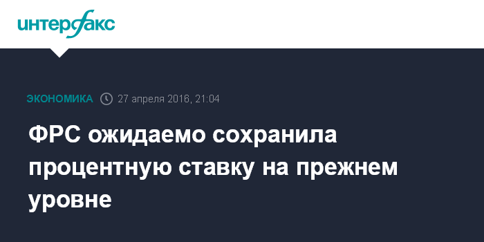 Москва. 27 апреля. INTERFAX.RU - Федеральная резервная система (ФРС) США по итогам заседания 26-27 апреля оставила процентную ставку по федеральным кредитным средствам (federal funds rate) в целевом диапазоне 0,25-0,5% годовых, говорится в коммюнике по результатам апрельского заседания Федерального комитета по открытым рынкам (FOMC).