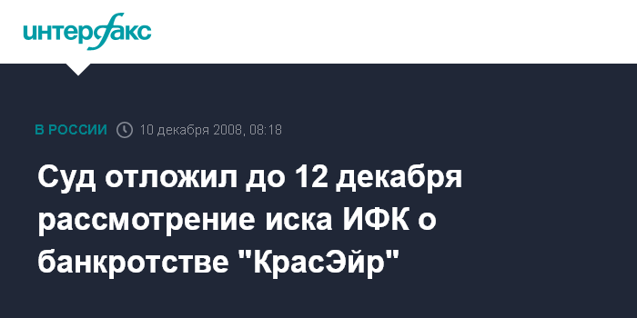 Москва. 10 декабря. INTERFAX.RU - Арбитражный суд Красноярского края на заседании в среду отложил до 12 декабря рассмотрение иска ОАО "Ильюшин Финанс Ко" (ИФК) о признании банкротом ОАО "Авиакомпания "Красноярские авиалинии" ("КрасЭйр", входил в альянс AiRUnion), сообщила "Интерфаксу" пресс-секретарь суда Валентина Безруких.