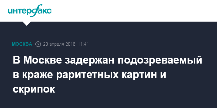Москва. 28 апреля. INTERFAX.RU - Московские полицейские задержали подозреваемого в похищении нескольких раритетных картин и скрипок, сообщила "Интерфаксу" официальный представитель МВД РФ Ирина Волк.
