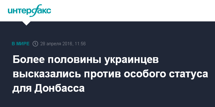 Москва. 28 апреля. INTERFAX.RU - Более половины граждан Украины негативно воспринимают идею предоставления Донбассу особого статуса, о чем свидетельствуют результаты мартовского опроса социологической службы Центра Разумкова.