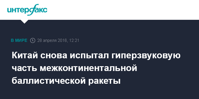 Москва. 28 апреля. INTERFAX.RU - Китайские военные провели успешное испытание гиперзвукового маневрирующего летательного аппарата, устанавливаемого на межконтинентальной баллистической ракете, сообщило издание The Washington Free Beacon, ссылаясь на представителей Пентагона.